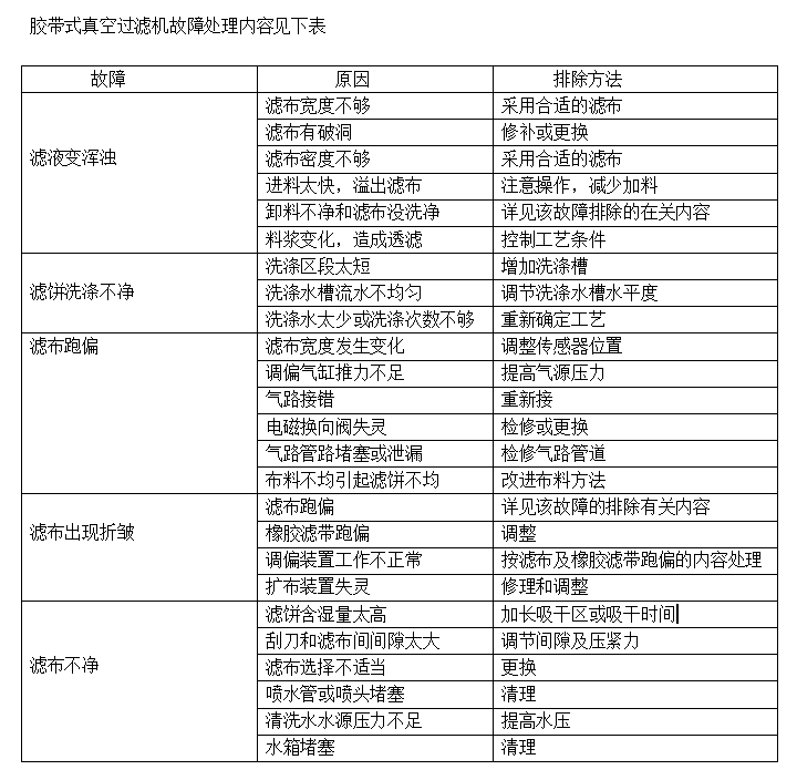 2.3.2濾餅卸凈后,將濾帶清洗1~2周,依次關閉淋洗液閥門→刷滾電機開關→濾帶再生水閥門→真空泵開關→主機電源開關→摩擦帶潤滑水閥門→總氣源開關→氣泵開關→打開氣泵放水閥。
