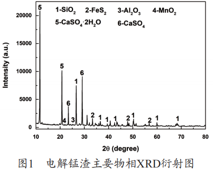 電解錳渣為粉末狀固體廢棄物,其為黑色細(xì)小顆粒,水分含量較多,平均含水量在30% 左右。本文對所選貴州地區(qū)電解錳渣中化學(xué)成分進(jìn)行分析測試,發(fā)現(xiàn)其主要元素組成為 O、P、K、Ca、Mg、S、Si、Mn、Fe、Na、Al 等,元素分析見表1。電解錳渣化學(xué)組成及含量見表2。圖1為所選電解錳渣 XRD 檢測結(jié)果,得出該電解錳渣的主要成分,含有的主要物相為石英(SiO2)、黃鐵礦(FeS2)、硫酸鈣(CaSO4)、生石膏(CaSO4· 2H2O)、氧化鋁以及氧化錳等。